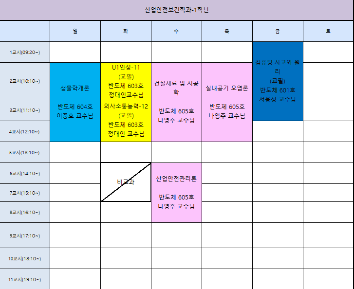 산업안전보건학과 2023학년도 2학기 1학년 시간표 입니다.